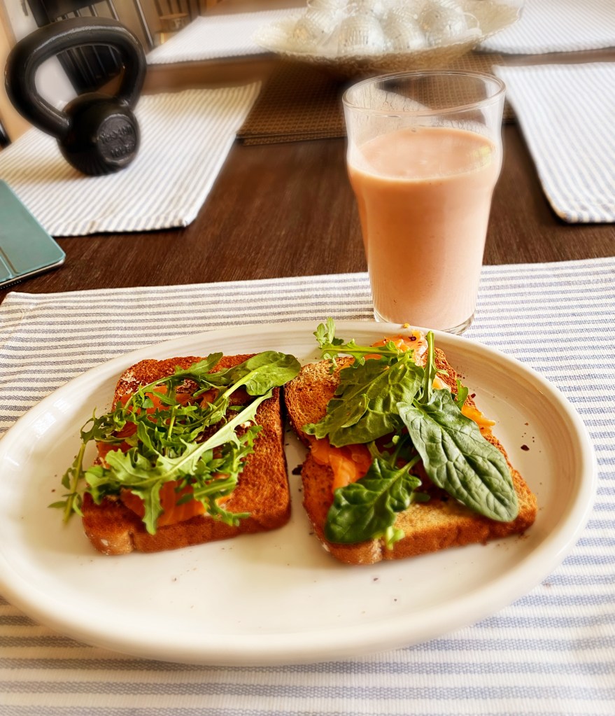 smoked salmon toast with fresh spinach and arugula. strawberry peach smoothie.