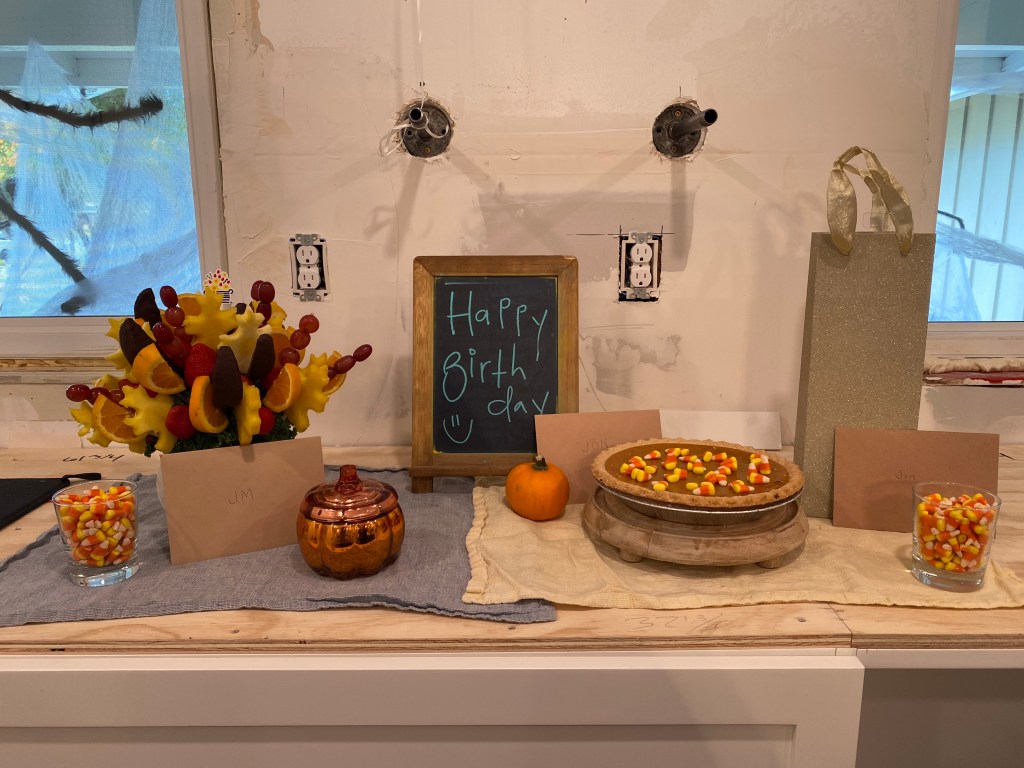 halloween birthday fruit bouquet, pumpkin pie with candy corn garnish